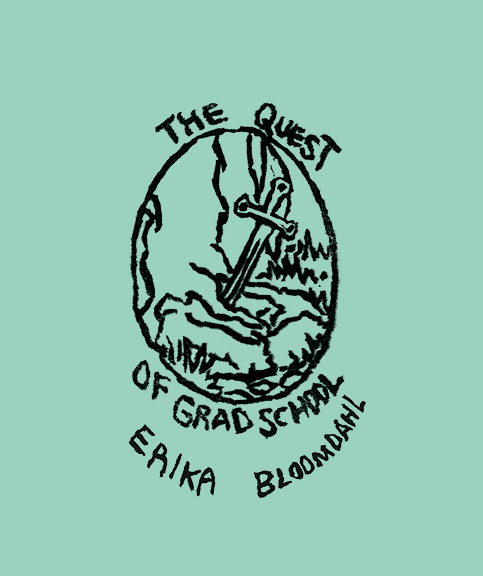 A six-page mini-comic conveying the process of deciding to go to graduate school through visuals of a knight accepting and completing a quest, with a hand-carved stamp for a cover.